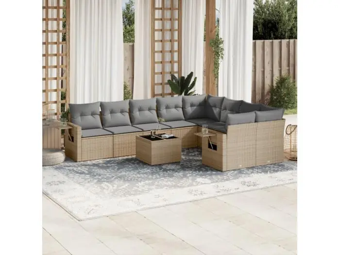 10-delige Loungeset met kussens poly rattan beige