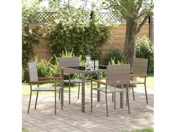 Deze moderne tuinset is de perfecte combinatie van stijl en functionaliteit voor elke buitenruimte. Als je van een eigentijdse sfeer houdt en van buiten zijn, dan is deze set iets voor jou. De strakke lijnen en het eenvoudige ontwerp passen perfect in elke tuin of op elk terras, waardoor je een geweldige plek hebt om samen te komen. Het polyrotan en gehard glas combineren prachtig – perfect om buiten te eten of gewoon te ontspannen. Of je nu een brunch organiseert of een ontspannen avond onder de sterrenhemel doorbrengt, deze set staat garant voor comfort en plezier. Materiaal polyrotan: De stoelen zijn bekleed met supersterk polyrotan, wat ze een moderne uitstraling geeft die stevig genoeg is voor buitengebruik. Ze zijn bestand tegen zon en vocht, waardoor ze lang mooi blijven.