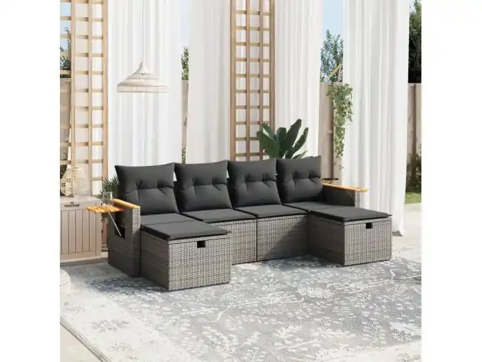 6-delige Loungeset met kussens poly rattan grijs