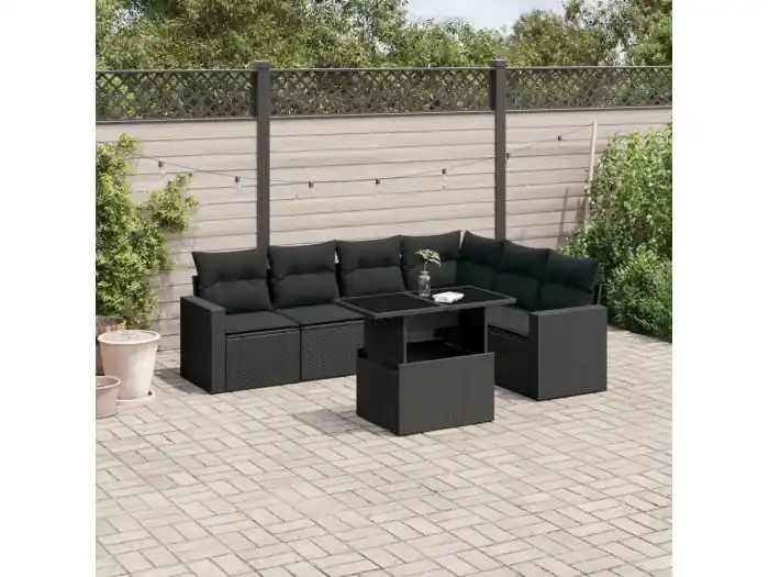 7-delige Loungeset met kussens poly rattan zwart