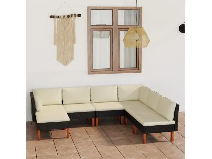 7-delige Loungeset met kussens poly rattan zwart