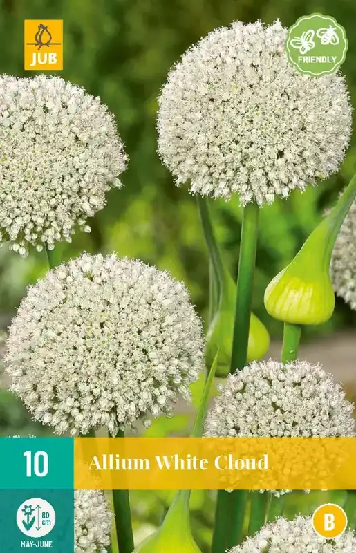 Een grootbloemige witte Alliumsoort. Zeer aanbevolen voor beplanting tussen vaste planten en voor verwildering. Deze Allium trekt tijdens de bloei vlinders aan. Allium White Cloud bloeit als de meeste vaste planten al flink in het blad zitten maar nog geen bloemen laten zien. Plant ze daarom dan ook in de vaste planten border.
