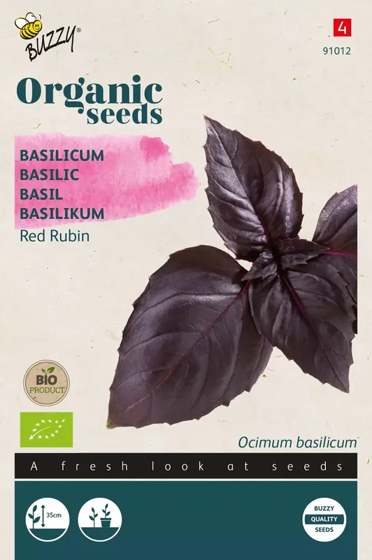 Basilicum – Red Rubin Zaaien van mei tot juli in een kweekbakje en na ca. vier weken uitplanten, of in een bloempot en wat uitdunnen. Het donkerpaars gekleurde blad is vers te gebruiken en zeer smaakvol. Een decoratieve basilicum die ook mooi in de border staat.