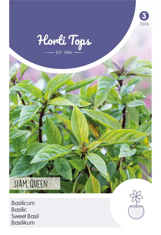 Basilicum – Siam QueenHalf mei tot juli in een kweekbakje en na ca. vier weken uitplanten, of in een bloempot en wat uitdunnen. Compacte Thaise basilicum met paarse bloemetjes; zeer geschikt voor balkon of siertuin.