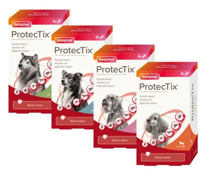 Beaphar ProtecTix? hond is een snelwerkende spot-on tegen teken, vlooien, bijtende luizen, zandvliegen, muggen en stalvliegen. Bij gebruik van de pipetten wordt het risico dat parasieten bijten en ziektes zoals Leishmaniose en Ehrlichiose overbrengen verminderd. De combinatie van de werkzame stoffen imidacloprid en permethrin biedt tot 4 weken bescherming. Na het aanbrengen van de spot-on worden de werkzame stoffen verspreid door de vetlaag van de huid, waardoor zich een beschermde laag vormt. Binnen 12 uur na toepassing, is de hond beschermd en zullen parasieten die in aanraking komen met het behandelde dier gedood of geweerd worden. Geschikt voor honden vanaf 7 weken en een gewicht van 1,5 tot 45 kilo. Product blijft werkzaam wanneer een hond nat wordt, veelvuldig zwemmen kan de werkingsduur wel verkorten.