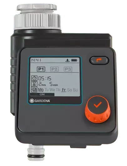 Met behulp van de GARDENA besproeiingscomputer kan de besproeiing flexibel en individueel worden ingesteld. Er kunnen maximaal drie verschillende en onafhankelijke planningen worden gemaakt. Het apparaat werkt op batterijen, is rechtstreeks op de kraan aangesloten en kan eenvoudig worden bediend met alleen een draai- en drukknop om de gegevens te selecteren en te bevestiging. Een gemakkelijk leesbaar display toont alle instellingen in ????n oogopslag. Het weerbestendige bedieningselement kan worden verwijderd. De besproeiingscomputer Select kan worden gebruikt in combinatie met een GARDENA bodemvochtigheidssensor.
