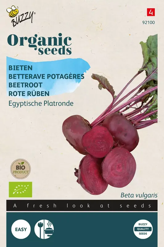 Bieten – Egyptische Platronde Half april-juli in de vollegrond zaaien in regels. Eventueel iets uitdunnen. Na het koken, de bietjes laten afkoelen en met bijvoorbeeld gevulde eieren als een salade opdienen.