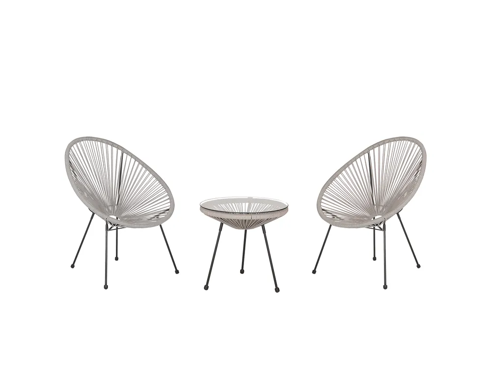 Trendy balkonset met twee draadstoelen in lichtgrijs. Deze vrolijke set bestaat uit een kleine ronde tafel en twee comfortabele stoelen. De stoelen zijn gemaakt van een stevige en bijzonder onderhoudsvriendelijke bedrading van lichtgrijs kunststof rotan gecombineerd met een stevig, zwart stalen frame. De tafel biedt genoeg ruimte voor je zomerse cocktails. Het kleine tafelblad van veiligheidsglas is bevestigd met stevige zuignappen. Hete zomerdagen zijn heerlijk te verdragen in de comfortabele en trendy spaghetti fauteuils. De bijzondere vormgeving geeft de stoel een heerlijk luchtig karakter. De set is een praktische metgezel voor alle binnen- en buitenruimtes.Details: Producttype: Bistroset. Stijl: Boho. Kleur: Grijs. Kap: Lichtgrijs. Soort materiaal: PE rotan. Hoofdmateriaal: PE rotan. Overig materiaal: Staal. Materiaal bovenkant: Glas. Afwerking: Gepoedercoat. Aantal zitplekken: 2 personen. Afmetingen: Afmetingen stoel: 70x90x87 cm. Afmetingen salontafel: 50x50x49. Hoogte zitting: 41 cm. Algehele afmetingen: 70x90x87. Gewicht: 17 kg. Draagvermogen stoel: 160 kg. Draagvermogen tafel: 50 kg. Aanbod omvat: 1 x Tafel, 2 x Stoel. Belangrijkste eigenschappen: Het tafelblad is met zuignapjes bevestigd., Lage en diepe zitvlak, Geschikt voor binnen- en buitengebruik, Beschermdoppen voor oppervlaktebescherming, Robuust tafelblad gemaakt van veiligheidsglas. Montageinformatie: Gedeeltelijke montage vereist.20-40 min.. Extra informatie: Let op! Gevaar voor beschadiging! Gebruik alsjeblieft geen messen of andere puntige of scherpe voorwerpen om de verpakking te openen, omdat dit het product kan beschadigen., Om de stabiliteit van de constructie en de veiligheid van het gebruik te garanderen, wordt aanbevolen om 2 weken na opstelling te controleren of het product correct is gemonteerd. Het is ook aan te raden om eens in de 3 maanden te controleren of de schroeven goed zijn aangedraaid. Tekst weerstand: UV-bestendige meubels hebben een verhoogde weerstand tegen vervaging of verkleuring. We raden echter aan om het product overdekt of onder een beschermhoes te bewaren wanneer het niet in gebruik is. Dit zorgt ervoor dat je langer kunt genieten van je tuinmeubels. Weerstand: Spat- / vochtbestendig. Onderhoudstips: PE rotan. 1.Maak schoon met een schoonmaakmiddel op zeepbasis. Gebruik geen sterke, chemische schoonmaakmiddelen., 2.Kijk uit met glazen servies of accessoires. Door de lichtreflectie door glas kan het oppervlak van het product worden beschadigd., 3.Bescherm de meubels van direct zonlicht om de levensduur van je meubels te verlengen., 4.Gebruik een beschermhoes, of zet de meubels op een droge en koele plek, buiten het seizoen. Staal. 1.Door gebruik te maken van een beschermhoes en de meubels droog te houden en regelmatig te reinigen, zal je de levensduur van de meubels verlengen., 2.Maak schoon met milde schoonmaakmiddelen., 3.Om de meubels te beschermen tegen corrosie, vermijd schoonmaakmiddelen met zure of basische componenten. Maak droog na reiniging., 4.Gebruik een beschermhoes of bewaar de meubels op een koele en droge plek wanneer deze niet in gebruik zijn., 5.Verwijder regelmatig de beschermdopjes om vocht eruit te halen. Laat ze drogen en gebruik eventueel een anti-corrosie spray wanneer nodig, voordat je de dopjes terug plaatst., 6.Bescherm plekken waar de beschermlaag beschadigd is van vochtigheid., 7.Let er bij dit meubel op dat het niet direct in contact komt met water. Hierdoor kan er roestig water uit de buizen gaan lekken.Veiligheidsglas. 1.Maak schoon met een mild schoonmaakmiddel of glasreiniger en een zachte doek. Maak droog na reiniging met een zachte doek., 2.Gebruik geen schurende schoonmaakmiddelen. Deze kunnen het oppervlak beschadigen., 3.Veeg droog na regen of sneeuw. Gebruik een beschermhoes, of bewaar de meubels op een koele, droge plek, buiten het seizoen., 4.Als het product een glazen craquele effect heeft dan is het belangrijk om het te beschermen tegen vocht.