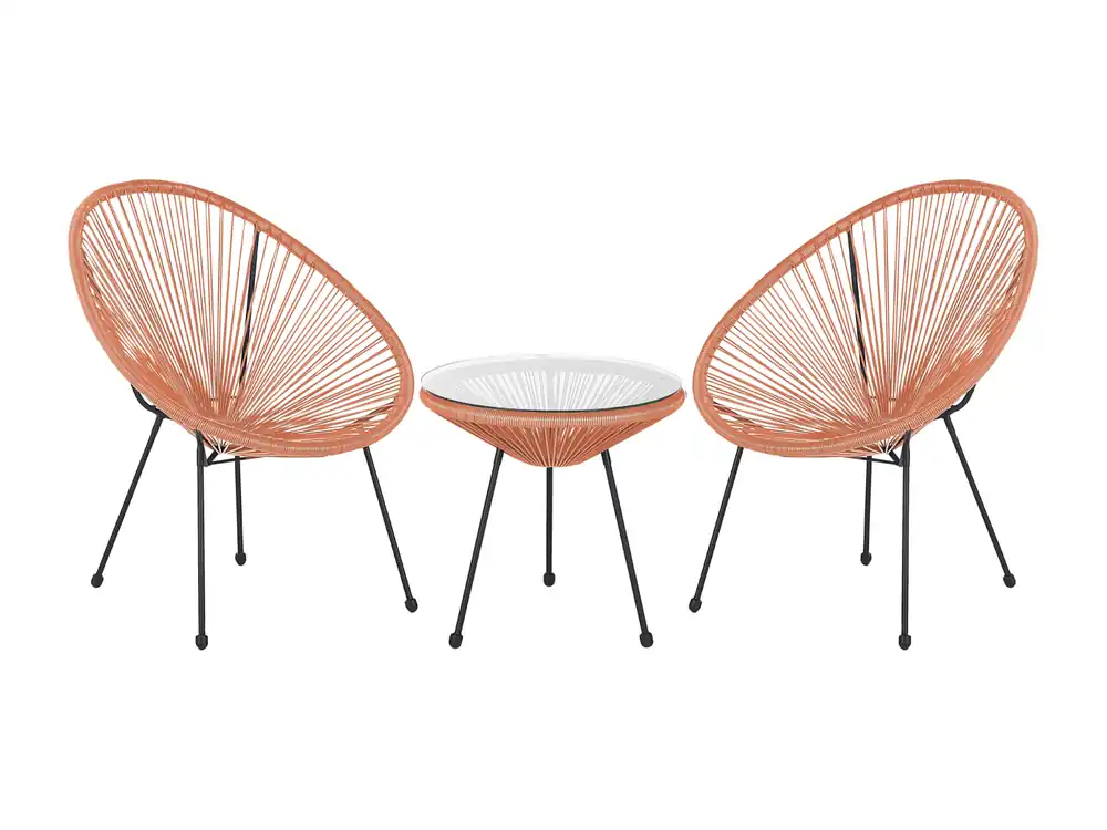Trendy balkonset met draadstoelen!. Deze multifunctionele set, bestaande uit 2 stoelen en een tafel, is geschikt voor zowel binnen als buiten. De zitting is voorzien van een PE-rotan vlechtwerk en een robuust frame van gepoedercoat staal. Het tafelblad is gemaakt van gehard glas en wordt vastgezet met zuignappen en biedt voldoende ruimte voor drankjes en snacks. Ge?nspireerd door het iconische Mexicaanse ontwerp, zal deze set je binnen- of buitenomgeving opfleuren en een opvallend accent toevoegen. Details: Producttype: Bistroset. Stijl: Boho. Kleur: Oranje. Soort materiaal: PE rotan. Hoofdmateriaal: PE rotan. Overig materiaal: Staal. Materiaal bovenkant: Glas. Afwerking: Gepoedercoat. Aantal zitplekken: 2 personen. Afmetingen: Afmetingen stoel: 70x90x87 cm. Afmetingen salontafel: 50x50x49. Hoogte zitting: 41 cm. Algehele afmetingen: 70x90x87. Gewicht: 17 kg. Draagvermogen stoel: 160 kg. Draagvermogen tafel: 50 kg. Aanbod omvat: 1 x Tafel, 2 x Stoel. Belangrijkste eigenschappen: Het tafelblad is met zuignapjes bevestigd., Lage en diepe zitvlak, Geschikt voor binnen- en buitengebruik, Beschermdoppen voor oppervlaktebescherming, Robuust tafelblad gemaakt van veiligheidsglas. Montageinformatie: Gedeeltelijke montage vereist.20-40 min.. Extra informatie: Let op! Gevaar voor beschadiging! Gebruik alsjeblieft geen messen of andere puntige of scherpe voorwerpen om de verpakking te openen, omdat dit het product kan beschadigen. Tekst weerstand: UV-bestendige meubels hebben een verhoogde weerstand tegen vervaging of verkleuring. We raden echter aan om het product overdekt of onder een beschermhoes te bewaren wanneer het niet in gebruik is. Dit zorgt ervoor dat je langer kunt genieten van je tuinmeubels. Weerstand: Spat- / vochtbestendig. Onderhoudstips: PE rotan. 1.Maak schoon met een schoonmaakmiddel op zeepbasis. Gebruik geen sterke, chemische schoonmaakmiddelen., 2.Kijk uit met glazen servies of accessoires. Door de lichtreflectie door glas kan het oppervlak van het product worden beschadigd., 3.Bescherm de meubels van direct zonlicht om de levensduur van je meubels te verlengen., 4.Gebruik een beschermhoes, of zet de meubels op een droge en koele plek, buiten het seizoen. Staal. 1.Door gebruik te maken van een beschermhoes en de meubels droog te houden en regelmatig te reinigen, zal je de levensduur van de meubels verlengen., 2.Maak schoon met milde schoonmaakmiddelen., 3.Om de meubels te beschermen tegen corrosie, vermijd schoonmaakmiddelen met zure of basische componenten. Maak droog na reiniging., 4.Gebruik een beschermhoes of bewaar de meubels op een koele en droge plek wanneer deze niet in gebruik zijn., 5.Verwijder regelmatig de beschermdopjes om vocht eruit te halen. Laat ze drogen en gebruik eventueel een anti-corrosie spray wanneer nodig, voordat je de dopjes terug plaatst., 6.Bescherm plekken waar de beschermlaag beschadigd is van vochtigheid., 7.Let er bij dit meubel op dat het niet direct in contact komt met water. Hierdoor kan er roestig water uit de buizen gaan lekken.Veiligheidsglas. 1.Maak schoon met een mild schoonmaakmiddel of glasreiniger en een zachte doek. Maak droog na reiniging met een zachte doek., 2.Gebruik geen schurende schoonmaakmiddelen. Deze kunnen het oppervlak beschadigen., 3.Veeg droog na regen of sneeuw. Gebruik een beschermhoes, of bewaar de meubels op een koele, droge plek, buiten het seizoen., 4.Als het product een glazen craquele effect heeft dan is het belangrijk om het te beschermen tegen vocht.