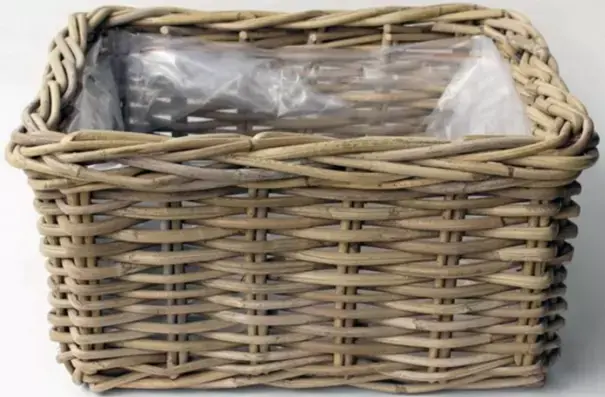 De bloembak is gemaakt van rotan. De binnenkant is afgedekt met plastic. De lengte van de mand is 40 cm, de breedte 40 cm ,de hoogte is 20 cm en heeft de kleur antiek grijs.