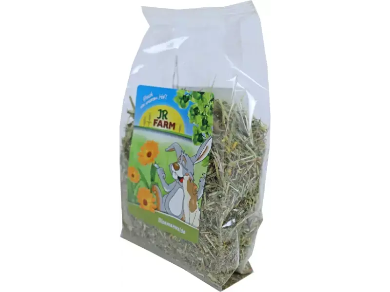 JR Farm Bloemenweide ?C gezond ruw voer voor elke dag. Deze geurige lekkernij voor fijnproevers bestaat uit met zorg gedroogd weidegras met aromatische bloemen en is daarom rijk aan natuurlijke vitamines. Het hoge gehalte aan ruwe vezels zorgt voor een optimale spijsvertering en verhoogt daarmee het welzijn. Heerlijk te mengen met hooi of andere kruiden of als aanvulling op de dagelijkse hooiportie.