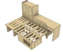 Dit zelfbouwpakket bevat een kastenwand en een uitschuifbare bedbank, om te bouwen tot 2 persoonsbed en te gebruiken als hoekbank.Met deze camper meubelset bouw je je eigen bus om tot luxe camper in een handomdraai. De meubels zijn ontworpen uit populieren multiplex 15mm. Het is onbehandeld materiaal, zodat je het zelf kunt afwerken met een laklaag naar wens.Het meubel is universeel en behoeft eventueel aanpassing aan de achterzijde van de meubels, naar eigen inzicht. Er is veel bergruimte in de bank voor eventueel je elektra of kampeerspullen.- Bedbank/hoekbank: 190cm lengte, diepte 65cm, 40cm hoog ?C breedte bed volledige breedte +/- 115cm?C Keukenblok (vaste zijde bus): totale lengte 220cm, hoge kast 80cm breed (124,5cm hoog) lage kast 140cm (met ruimte voor de koelkast d=51, b=38, h=53) , diepte 45/50cm, hoogte 71,5cmAl het houtwerk, scharnieren en schroeven worden meegeleverd en alle scharniergaten en schroefgaatjes zijn voorgeboord. Let op: exclusief vloer, exclusief installaties.
