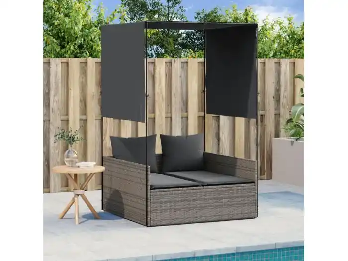 Dubbele chaise longue met dak en grijze geweven harsgordijnen