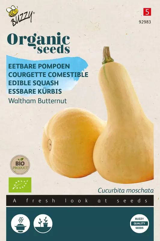 Eetbare pompoen – Waltham Butternut Zaai vanaf eind april-half juni in de vollegrond op een zaaibed en plant uit in een vruchtbare grond. Een zoete, oranjevlezige en pindavormige kalebas. Zeer geschikt om te bakken of te pureren.