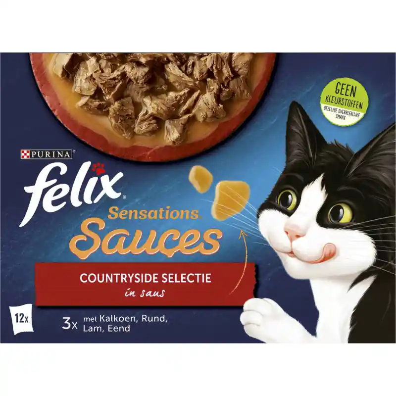 Felix Sensations Sauces Countryside Selectie biedt malse stukjes in smakelijke saus, rijk aan omega 6, vitamines D en E, zonder kunstmatige toevoegingen, voor een volledige en gebalanceerde voeding.