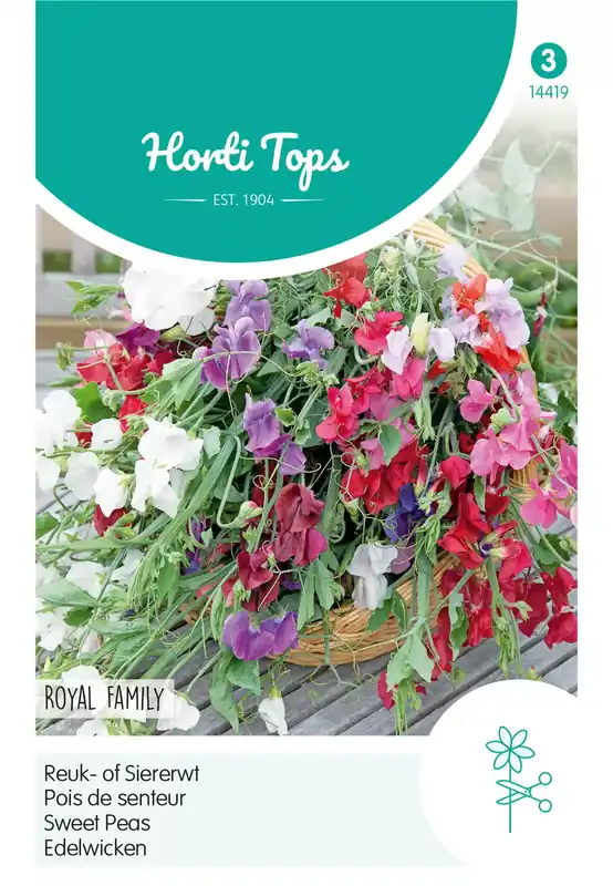 Reuk- of Siererwt – Royal Family gemengdLathyrus kan direct op de plaats van bestemming worden gezaaid vanaf half maart tot eind mei. Bemesten met gedroogde koemest of met goede compost bevordert een rijke bloei.