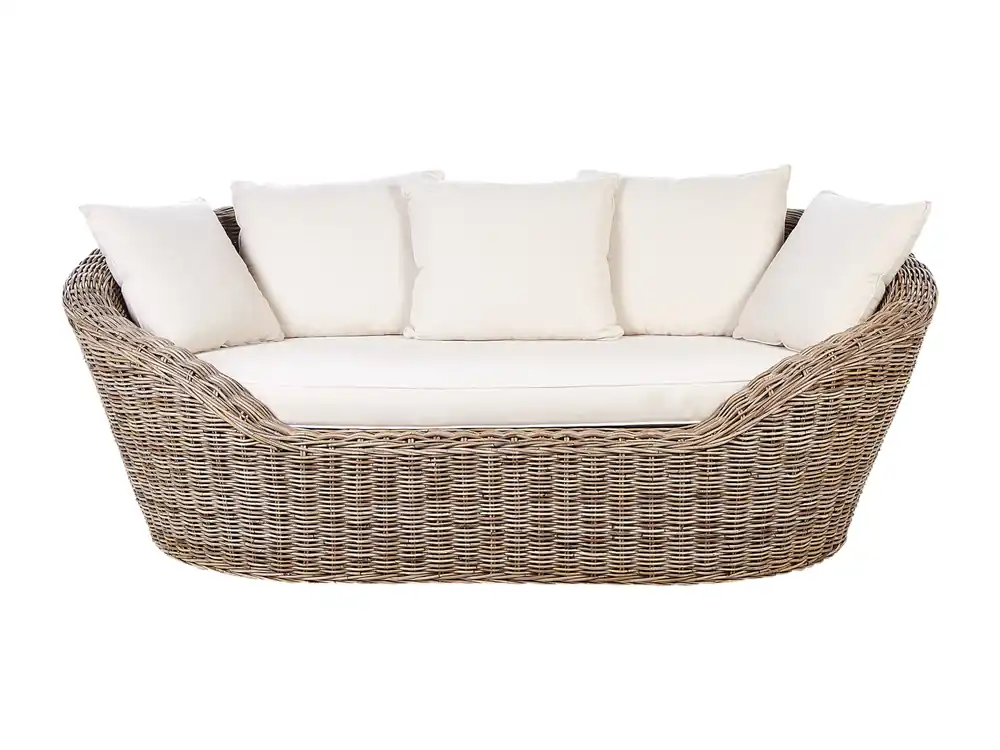 Rieten tuinbank met kussens. Geniet van ontspanning met dit handgemaakte rieten rotan ligbed, zorgvuldig geweven voor zowel stijl als comfort. Zak weg in het pluche zitkussen en leun achterover tegen de vijf bijbehorende kussens, die stuk voor stuk ontworpen zijn voor ultieme gezelligheid. De hoezen zijn afneembaar met ingebouwde ritsen en het onderhoud is moeiteloos, zodat je plekje dag na dag uitnodigend blijft.Details: Producttype: Loungefauteuil. Stijl: Boho. Kleur: Natuurlijk. Kap: Lichtbeige. Soort materiaal: Rotan. Hoofdmateriaal: Rotan. Overig materiaal: Polyester. Material Composition: 40% polyester. Afwerking: Geborsteld. Dichtheid schuim zitting: 18 kg/m3. Aantal zitplekken: 2 personen. Afmetingen: Diepte: 124 cm. Dikte zitting: 10 cm. Hoogte zitting: 48 cm. Breedte: 227 cm. Hoogte: 80 cm. Zitoppervlak: 171×95 cm. Gewicht: 51 kg. Draagvermogen per persoon: 100 kg. Aanbod omvat: 1 x Ligbed, 1 x Zitkussen, 5 x Rugleuning kussen. Belangrijkste eigenschappen: Uitstekende plek om te ontspannen, Traditioneel design met een moderne twist, Solide afwerking, Onderhoudsvriendelijk en duurzaam materiaal, Handgemaakte precisie, Verwijderbare kussenhoezen. Montageinformatie: Geen montage benodigd. Extra informatie: Houd er rekening mee dat dit product gevoelig is voor weersomstandigheden en dus binnen moet worden opgeborgen wanneer het niet in gebruik is, Het is niet aanbevolen om tijdens stevige buien het meubilair onder alleen een hoes buiten te laten. We raden aan om buiten het seizoen, de meubels op te slaan op een droge en koele plek., Voor dit product bieden we een gedetailleerd onderhoudsboek aan om ervoor te zorgen dat het meubilair er zo lang mogelijk goed uit blijft zien. Bekijk de onderhoudsinstructies en tips om goed voor je nieuwe product te kunnen zorgen – je vindt deze bij de montagehandleiding van het product op onze website., Elk product is met de hand gemaakt. Daardoor zullen er verschillen zxijn in textuur en kleur. Dit zijn karakteristieken van het materiaal en worden niet beschouwd als een kwaliteitsfout. Tekst weerstand: Dit product is bestand tegen wind. Het zal dus niet om vallen of zijn stabiliteit verliezen door een windvlaag. Weerstand: Windbestendig. Onderhoudstips: Rotan. 1.Vermijd langdurige blootstelling aan zowel sterk, direct zonlicht, als vochtigheid en regen., 2.Maak schoon met een zachte, vochtige doek en veeg daarna goed droog., 3.De meubels zullen buiten het seizoen, of wanneer ze niet gebruikt worden, binnen moeten worden geplaatst. Polyester. 1.Niet geschikt voor de droger of om te strijken., 2.Was met de hand of selecteer het wasprogramma voor wol (30???C), tenzij de fabrikant anders aangeeft. Was op de rechterkant met de rits gesloten., 3.Wanneer niet in gebruik, bewaar het product op een schone, droge plek om het te beschermen tegen weersomstandigheden.
