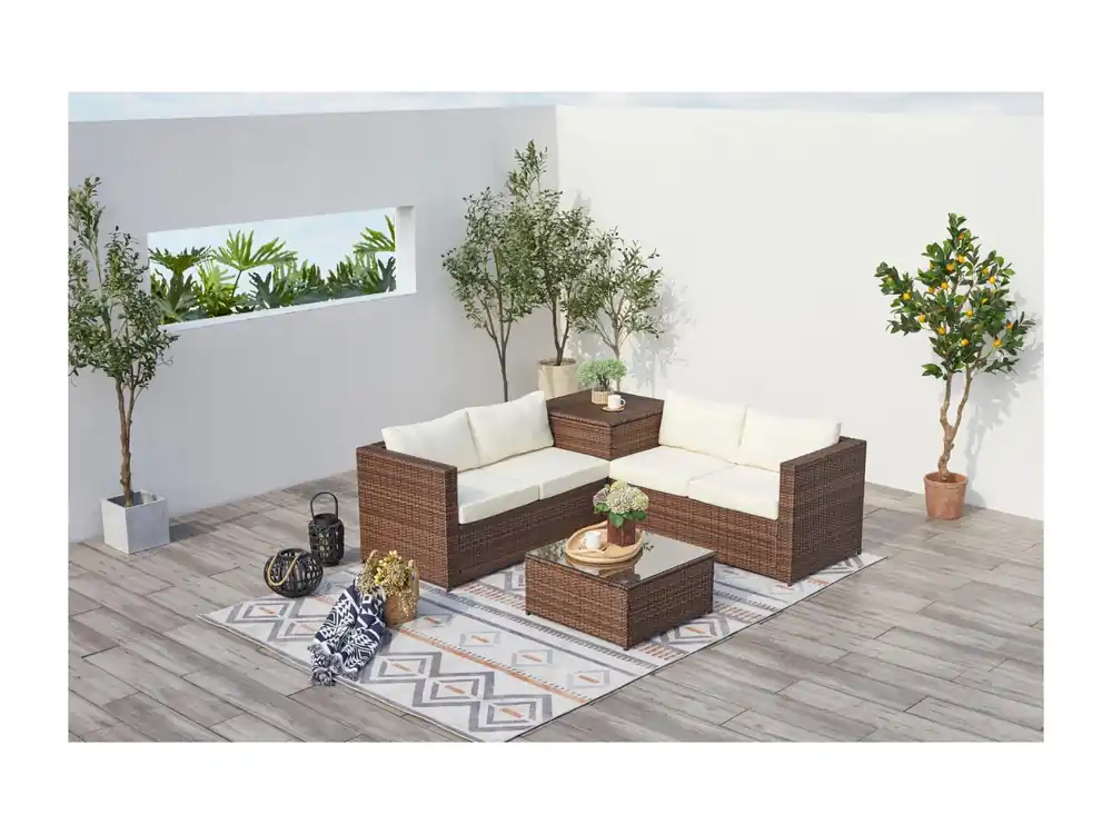 Loungeset voor 4 personen van bruin/wit gevlochten kunsthars met ge?ntegreerde opbergbox – Comfortabel en trendy