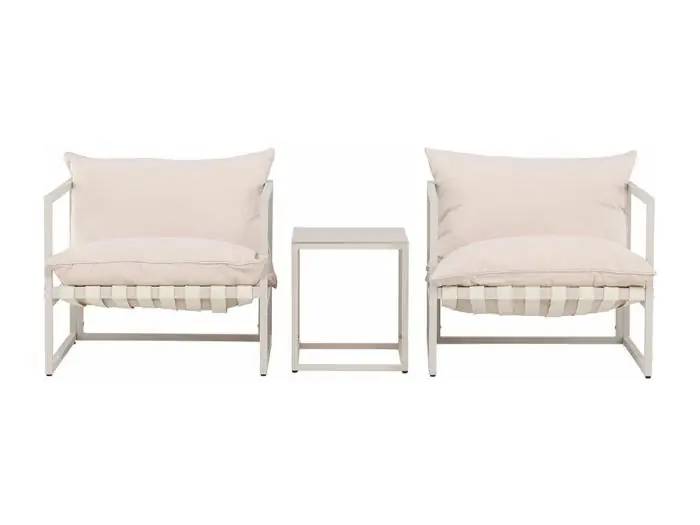 De Messina tuinset in beige is de perfecte keuze om buiten te ontspannen en te eten. De set bestaat uit een eettafel en vier stoelen, allemaal ontworpen met zowel comfort als stijl in focus. De tafel meet H45xB40xD50 cm en biedt praktische ruimte voor het opbergen van drankjes of kleine spullen. De stoelen, met de afmetingen H61xB75xD75 cm, zijn voorzien van zachte kussens die zorgen voor een ontspannen zitervaring. De beige kleur en heldere kussens, gecombineerd met het moderne frame, maken deze set een tijdloze en elegante toevoeging aan elk buitendecor.