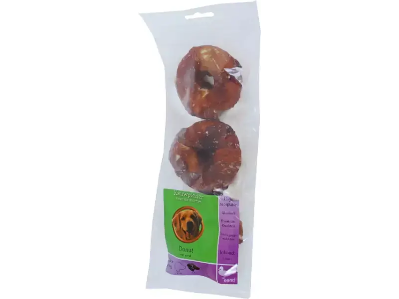 Donuts van witte buffelhuid met eend, deze smakelijke combinatie maakt dit tot een onweerstaanbare snack voor honden. Hoge acceptatie, glutenvrij, toevoegingsmiddelen en van premium kwaliteit. Ook staat er op iedere verpakking een kauwlevel vermeld die de hardheid aangeeft van level 1 tot 3. Deze donuts van witte buffelhuid met eend is kauwlevel 2 (middel) en daardoor geschikt voor honden met een gemiddelde kauwkracht. Zak ?? 3 stuks verpakt.