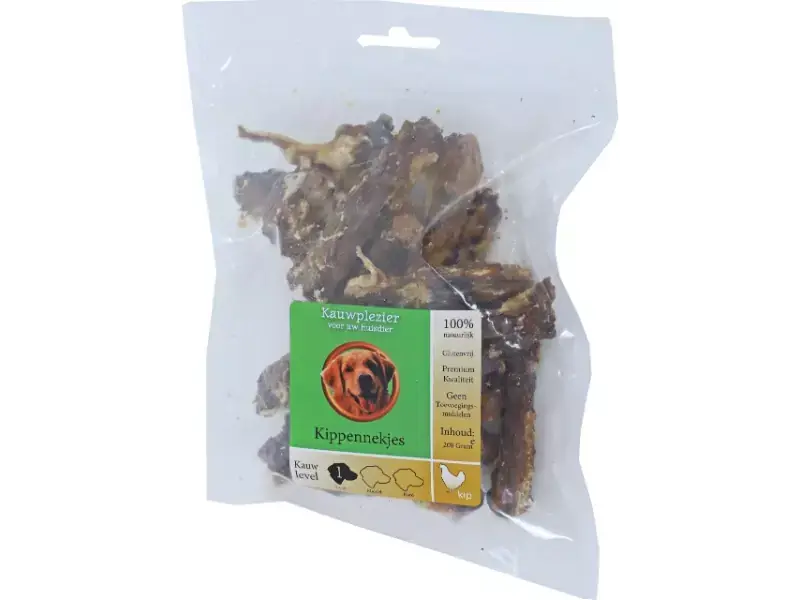 Deze kippennekjes zijn gerookt en zijn een heerlijke traktatie voor uw trouwe viervoeter. 100% natuurlijk, glutenvrij, premium kwaliteit en zonder toevoegingsmiddelen. Ook staat er op iedere verpakking een kauwlevel vermeld die de hardheid aangeeft van level 1 tot 3. Deze kippennekjes zijn kauwlevel 1 (zacht) en daardoor ook bijzonder geschikt voor pups en oudere honden. 200 gram per verpakking.