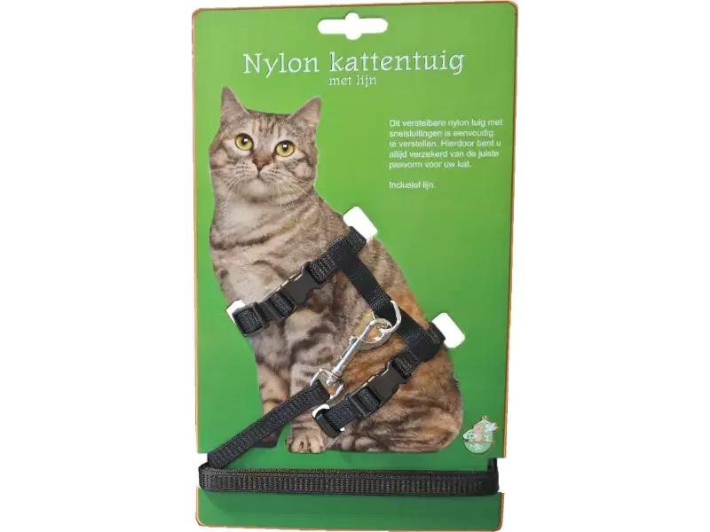 Nylon kattentuig met lijn. Dit verstelbaar nylon tuig met snelsluitingen is eenvoudig te verstellen. Hierdoor bent u altijd verzekerd van de juiste pasvorm voor uw kat. Inclusief lijn. Verkrijgbaar in meerdere kleuren.