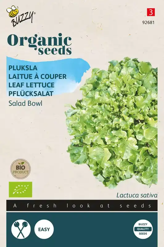 Pluksla – Salad Bowl, groen Maart-eind augustus in de vollegrond in regels zaaien. Niet te dicht bij elkaar zaaien, eventueel iets uitdunnen. Laat het hart van de plant intact, om vaker te kunnen oogsten. Zeer geschikt om gerechten mee te garneren.