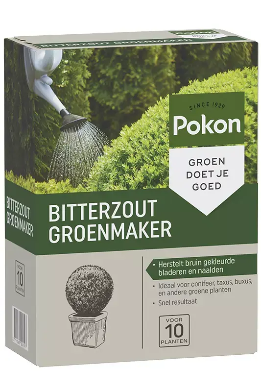 Bij coniferen wijzen bruine naalden meestal op een magnesiumgebrek. Bij andere planten, zoals buxus, veroorzaakt een magnesium gebrek vergeelde bladeren. Dit is eenvoudig op te lossen met Pokon Bitterzout Groenmaker. Pokon Bitterzout Groenmaker kan in de periode van maart t/m september gebruikt worden. Een herhaalde behandeling kan noodzakelijk zijn. Wacht minimaal 4 tot 6 weken met de volgende behandeling. Niet gebruiken bij hoge temperaturen (boven 25??C). Bij voorkeur ??s ochtends of ??s avonds gebruiken om fel zonlicht te vermijden.