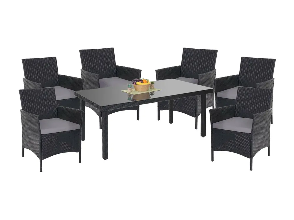 – Leveringsomvang: 1x tafel met glazen blad, 6x fauteuils (zonder decoratie)- tafelpoten met verstelbare kunststof schroeven om oneffenheden te compenseren- kussenhoes met rits- waterafstotende hoezen- kussenhoes: 100% polyester- frame van stevig staal- onderhoudsvriendelijk polyrotan- stevig glazen bladAfmetingen (HxBxD) (ongeveer): Stoel: 83 x 59 x 60 cm Tafel: 74,5 x 160 x 90 cm Hoogte zitkussen: 5 cm Zithoogte met kussen: 47 cm Hoogte rugleuning (gemeten vanaf de zitting): 45 cm Hoogte armleuning (gemeten vanaf de zitting): 22 cm Hoogte armleuning (gemeten vanaf vloer): 64 cm Dikte glazen blad: 0,5 cmMateriaal: Vlechtwerk: poly rotan Frame: staal Kussenhoes: 100% polyester Tafelblad: glasDeze eenvoudige set past met zijn ingetogen ontwerp naadloos in elke omgeving en ziet er altijd uit alsof hij erbij hoort. Deze goed gemaakte set is het ideale middelpunt voor iedereen die op zoek is naar een plek met dat beetje extra. De bekleding rondt het smaakvolle totaalbeeld van dit elegante zitmeubel af en maakt het een must-have voor iedereen die wat ontspannende uurtjes wil doorbrengen of het wachten wil verkorten.Poly rotan is niet zomaar een materiaal, maar is al jaren (bijna zonder alternatief) HET materiaal voor topklasse (tuin)meubilair. Waarom dat zo is? Blij dat u het vraagt! Hoewel ons poly rotan eruitziet als conventioneel rotan en producten dus een ongelooflijk natuurlijke uitstraling geeft, heeft het duidelijke voordelen. Niet alleen is het waterbestendig en zeer gemakkelijk te onderhouden, het is ook zeer slijtvast en heeft niet de neiging te gaan vezelen.Belangrijk – let op: Wordt in meerdere pakketten tegelijk verzonden. We kunnen echter niet garanderen dat ze op hetzelfde moment aankomen. Het kan nodig zijn om de pakketten met 2 verschillende logistieke bedrijven te verzenden.Na overhandiging aan de transporteur kan de levertijd oplopen tot twee weken. De transporteur krijgt de opdracht om een bezorgdatum met u af te spreken. Zoals gebruikelijk is de levering altijd gratis langs de stoeprand – transport naar je huis of montage van de goederen is NIET inbegrepen. Controleer de goederen bij ontvangst. Noteer eventuele gebreken gedetailleerd op de afleverbon. We zullen dan proberen je zo snel mogelijk een vervangend onderdeel te sturen of een korting uit te betalen. Weiger nooit om de goederen in ontvangst te nemen.Algemene montage-instructies: Zorg ervoor dat u de schroeven niet meteen aandraait wanneer u producten monteert. Anders kunnen de frames krom trekken en passen de boorgaten niet meer in de schroeven. Het is daarom verstandiger om de schroeven eerst alleen aan te draaien zodat ze goed vastzitten en ze daarna pas vast te draaien.