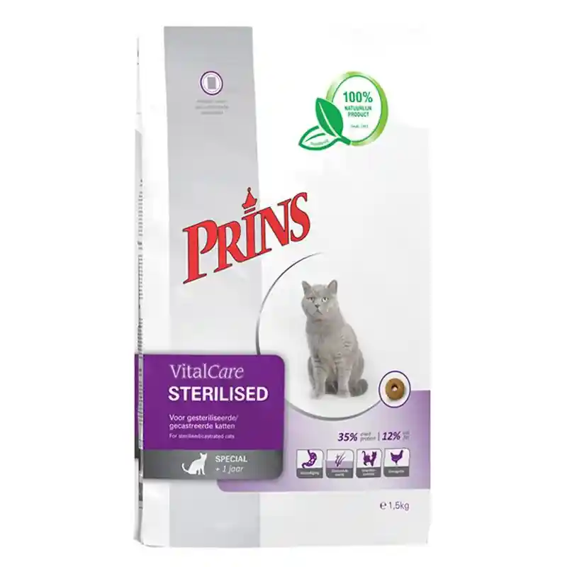 Prins VitalCare Sterilised is geschikt voor gesteriliseerde en gecastreerde katten. Door de extra voedingsvezels in de voeding zorgen voor een verzadigd gevoel en helpen de kat een gezond gewicht te behouden.