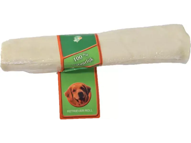 Witte retriever roll van runderhuid. Gemaakt van een zware kwaliteit onderhuids bindweefsel, voor extra lang kauwplezier. Goed voor het gebit.. Per stuk verpakt.