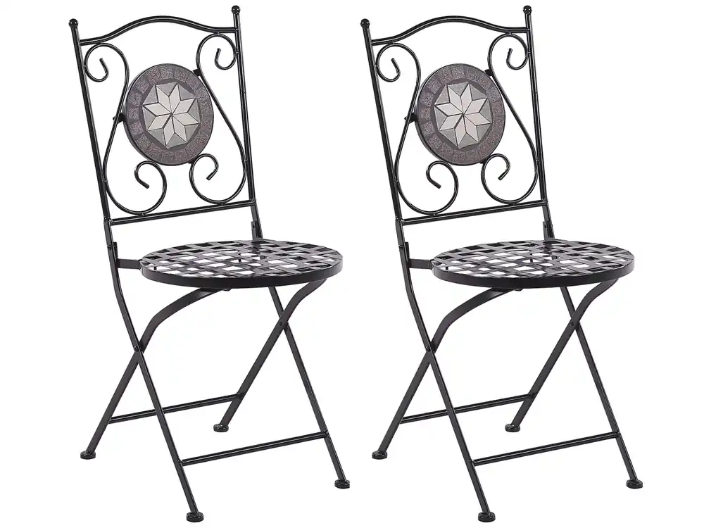 Klapstoelen in vintage stijl. Geniet van een kopje thee in de zon met deze charmante tuinstoelenset. Het is perfect voor kleine en grote ruimtes, heeft gebeeldhouwde rugleuningen en een intrigerend moza?ekpatroon gemaakt van keramische tegels. Style de stoelen in je achtertuin of balkon om een ??knus hoekje te cre?ren waar je heerlijk kunt ontspannen. De stoelen zijn gemaakt van metaal en hebben geen last van regen en dankzij de opklapfunctie zijn ze supergemakkelijk op te bergen.Details: Producttype: Tuinstoel. Stijl: Retro. Kleur: Zwart. Soort materiaal: Metaal. Hoofdmateriaal: IJzer. Overig materiaal: Keramiek. Material poten: Metaal. Materiaal zitting: Metaal. Armleuning: Nee. Afwerking: Gepoedercoat. Opvouwbaar: Ja. Stapelbaar: Nee. Afmetingen: Diepte: 45 cm. Hoogte zitting: 45 cm. Breedte: 38 cm. Hoogte: 89 cm. Zitoppervlak: 38×38 cm. Gewicht: 7 kg. Draagvermogen: 120 kg. Aanbod omvat: 2 x Stoel. Belangrijkste eigenschappen: Speciaal gemaakt voor gebruik buitenshuis, Ruimtebesparend inklapbaar. Montageinformatie: Geen montage benodigd. Tekst weerstand: UV-bestendige meubels hebben een verhoogde weerstand tegen vervaging of verkleuring. We raden echter aan om het product overdekt of onder een beschermhoes te bewaren wanneer het niet in gebruik is. Dit zorgt ervoor dat je langer kunt genieten van je tuinmeubels. Weerstand: Windbestendig. Onderhoudstips: IJzer. 1.Door gebruik te maken van een beschermhoes en de meubels droog te houden en regelmatig te reinigen, zal je de levensduur van de meubels verlengen., 2.Maak schoon met milde schoonmaakmiddelen., 3.Om de meubels te beschermen tegen corrosie, vermijd schoonmaakmiddelen met zure of basische componenten. Maak droog na reiniging., 4.Gebruik een beschermhoes of bewaar de meubels op een koele en droge plek wanneer deze niet in gebruik zijn., 5.Verwijder regelmatig de beschermdopjes om vocht eruit te halen. Laat ze drogen en gebruik eventueel een anti-corrosie spray wanneer nodig, voordat je de dopjes terug plaatst., 6.Bescherm plekken waar de beschermlaag beschadigd is van vochtigheid., 7.Let er bij dit meubel op dat het niet direct in contact komt met water. Hierdoor kan er roestig water uit de buizen gaan lekken. Keramiek. 1.Maak schoon met een mild schoonmaakmiddel en een zachte doek, en droog de meubels daarna af., 2.Het materiaal is bestand tegen gemiddelde weersomstandigheden. Toch adviseren we je, buiten het seizoen, gebruik te maken van een beschermhoes, of de meubels op een koele, droge plek te bewaren.