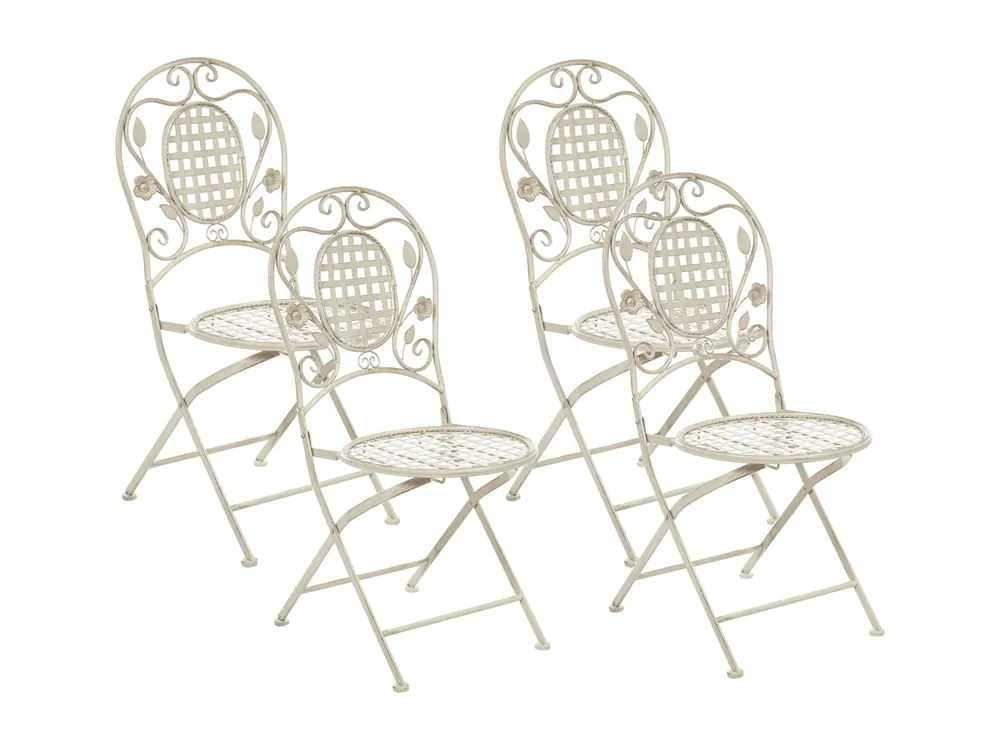 Set van 4 inklapbare balkonstoelen in cremewit. Voeg een vleugje Proven?aalse stijl toe aan je balkon of tuin met deze elegante set van vier stoelen. De tuinstoelen zijn gemaakt van gepoedercoat ijzer en hebben een verweerd effect en een opengewerkt ontwerp met bloemenornamenten. Combineer stoelen met een bijpassende tafel om de perfecte plek te cre?ren voor ontbijt of lunch in elke buitenomgeving. De stoelen zijn inklapbaar, dus je kunt ze ook buiten het seizoen makkelijk opbergen.Details: Producttype: Tuinstoel. Stijl: Retro. Kleur: Wit. Kap: Gebroken wit. Soort materiaal: Metaal. Hoofdmateriaal: IJzer. Material poten: Metaal. Materiaal zitting: Metaal. Armleuning: Nee. Afwerking: Gepoedercoat. Opvouwbaar: Ja. Stapelbaar: Nee. Afmetingen: Diepte: 52 cm. Hoogte zitting: 42 cm. Breedte: 43 cm. Hoogte: 93 cm. Zitoppervlak: 40×40 cm. Gewicht: 5 kg. Draagvermogen: 120 kg. Aanbod omvat: 4 x Stoel. Belangrijkste eigenschappen: Retro stijl, Solide afwerking, UV-bestendigheidsklasse, Opgevouwen op te bergen, Non-slip dopjes, Compact en daardoor perfect voor kleine ruimtes. Montageinformatie: Geen montage benodigd. Extra informatie: Let op! Gevaar voor beschadiging! Gebruik alsjeblieft geen messen of andere puntige of scherpe voorwerpen om de verpakking te openen, omdat dit het product kan beschadigen., De zichtbare oneffenheden, vlekken en vervaagde effecten die zichtbaar zijn op het product zijn opzettelijk en worden niet beschouwd als productfout. Tekst weerstand: UV-bestendige meubels hebben een verhoogde weerstand tegen vervaging of verkleuring. We raden echter aan om het product overdekt of onder een beschermhoes te bewaren wanneer het niet in gebruik is. Dit zorgt ervoor dat je langer kunt genieten van je tuinmeubels. Weerstand: Spat- / vochtbestendig. Onderhoudstips: IJzer. 1.Door gebruik te maken van een beschermhoes en de meubels droog te houden en regelmatig te reinigen, zal je de levensduur van de meubels verlengen., 2.Maak schoon met milde schoonmaakmiddelen., 3.Om de meubels te beschermen tegen corrosie, vermijd schoonmaakmiddelen met zure of basische componenten. Maak droog na reiniging., 4.Gebruik een beschermhoes of bewaar de meubels op een koele en droge plek wanneer deze niet in gebruik zijn., 5.Verwijder regelmatig de beschermdopjes om vocht eruit te halen. Laat ze drogen en gebruik eventueel een anti-corrosie spray wanneer nodig, voordat je de dopjes terug plaatst., 6.Bescherm plekken waar de beschermlaag beschadigd is van vochtigheid., 7.Let er bij dit meubel op dat het niet direct in contact komt met water. Hierdoor kan er roestig water uit de buizen gaan lekken.