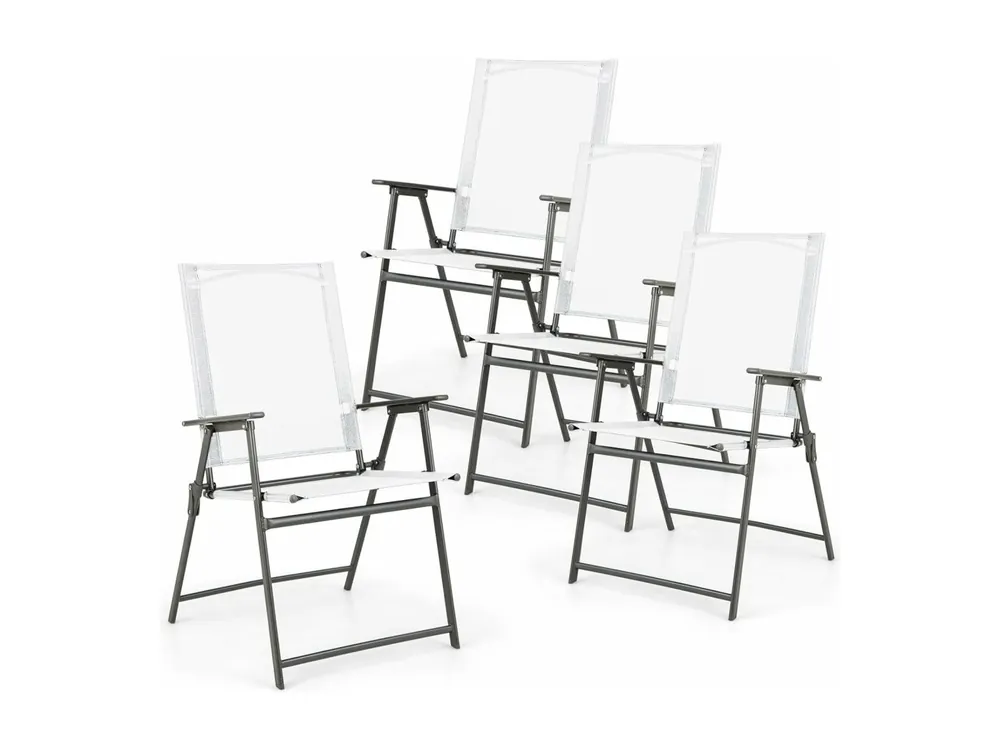 Deze 4-delige tuinstoelset bestaat uit ademende stof en een robuust metalen frame, is lichtecht en kan vele jaren lang worden gebruikt. Het inklapbare ontwerp maakt de stoelen eenvoudig op te bergen en te vervoeren en ideaal voor gebruik buitenshuis. Hoge rugleuningen, brede stoelen en gladde armleuningen zijn ergonomisch ontworpen om je een aangename zitervaring te bieden. Deze metalen terrasstoelset kan met verschillende tafels worden gecombineerd en is perfect geschikt voor plaatsing in je tuin, achtertuin, balkon, zwembad enz., zodat je met je familie of vrienden van je vrije tijd kunt genieten.