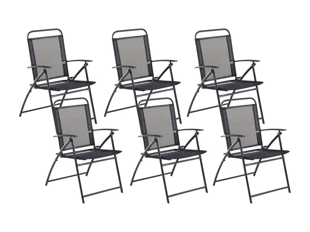Set van 6 moderne inklapbare stoelen. De klapstoelen met brede armleuningen kunnen snel worden neergezet als je extra zitplaatsen nodig hebt. Ze zijn inklapbaar om ruimte te besparen en kunnen dus ook prachtig mee op vakantie, naar het strand of naar een picknick. De flexibele klapstoelen zijn gemaakt van gepoedercoat, zwart staal met een bekleding van zwart textiel.Details: Producttype: Tuinstoel. Stijl: Retro. Kleur: Zwart. Soort materiaal: Metaal. Hoofdmateriaal: Staal. Overig materiaal: Polyester. Material poten: Kunststof. Materiaal zitting: Stof. Material Composition: 100% polyester. Armleuning: Ja. Afwerking: Gepoedercoat. Opvouwbaar: Ja. Stapelbaar: Nee. Afmetingen: Hoogte armleuningen: 60 cm. Diepte: 66 cm. Hoogte zitting: 38 cm. Breedte: 48 cm. Hoogte: 90 cm. Zitoppervlak: 45×45 cm. Gewicht: 4 kg. Draagvermogen: 110 kg. Aanbod omvat: 6 x Stoel. Belangrijkste eigenschappen: Brede, comfortabele zitoppervlak, Modern design, Hoogwaardige kwaliteitsmaterialen, Solide afwerking, UV-bestendigheidsklasse 4 (ISO 105-B05), Opgevouwen op te bergen. Montageinformatie: Geen montage benodigd. Tekst weerstand: UV-bestendige meubels hebben een verhoogde weerstand tegen vervaging of verkleuring. We raden echter aan om het product overdekt of onder een beschermhoes te bewaren wanneer het niet in gebruik is. Dit zorgt ervoor dat je langer kunt genieten van je tuinmeubels. Weerstand: Vlekbestendig. Onderhoudstips: Staal. 1.Door gebruik te maken van een beschermhoes en de meubels droog te houden en regelmatig te reinigen, zal je de levensduur van de meubels verlengen., 2.Maak schoon met milde schoonmaakmiddelen., 3.Om de meubels te beschermen tegen corrosie, vermijd schoonmaakmiddelen met zure of basische componenten. Maak droog na reiniging., 4.Gebruik een beschermhoes of bewaar de meubels op een koele en droge plek wanneer deze niet in gebruik zijn., 5.Verwijder regelmatig de beschermdopjes om vocht eruit te halen. Laat ze drogen en gebruik eventueel een anti-corrosie spray wanneer nodig, voordat je de dopjes terug plaatst., 6.Bescherm plekken waar de beschermlaag beschadigd is van vochtigheid., 7.Let er bij dit meubel op dat het niet direct in contact komt met water. Hierdoor kan er roestig water uit de buizen gaan lekken. Polyester. 1.Maak schoon met een mild schoonmaakmiddel op zeepbasis en een zachte doek., 2.Houd uit de buurt van warmtebronnen, zoals de barbecue of vuurkorf, aangezien vonken het meubelstuk kunnen beschadigen. Leg daarom ook geen hete gebruiksvoorwerpen, zoals hete barbecuetangen, op het oppervlak., 3.Het materiaal is bestand tegen gemiddelde weersomstandigheden. Maak buiten het seizoen gebruik van een beschermhoes of bewaar de meubels op een koele, droge plek.