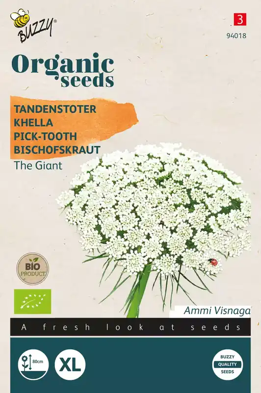 Ammi visnaga Tandenstoter The Giant – E??njarig Zaaien van april tot juni, direct in de vollegrond. Het teveel aan opgekomen planten wegnemen, maar deze niet verspenen. Ammi visnaga heeft fijn blad en mooie decoratieve groenig-witte bloemschermen.