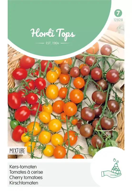 Kers-tomaten – MixtureVanaf eind februari in een zaaibakje bij 20??C of later buiten onder glas. Na verspenen, in een kasje of in potten uitplanten. 4 vari?teiten, apart verpakt: Kerstomaten Sweetie rood – Cereza amarilla geel – Bottondoro oranje – Black Cherry zwart.