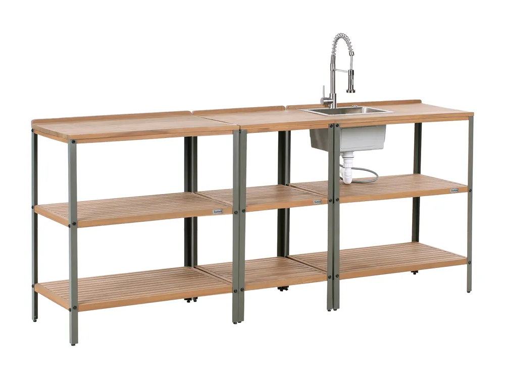 Buitenkeuken set met roestvrijstalen wastafel. Cre?er een complete buitenkeuken met deze stijlvolle keukenset, bestaande uit drie kookeilanden, waarvan ????n met ingebouwde spoelbak. Elk eiland is gemaakt van massief acaciahout en verstevigd met een stevig metalen frame, met een ruim aanrecht om op te koken, op te dienen of af te wassen. Met een perfecte mix van open opbergruimte en functionaliteit brengt deze set structuur en elegantie in je tuinbijeenkomsten.Details: Producttype: Buitenkeuken. Stijl: Traditioneel. Kleur: Bruin. Soort materiaal: Hout. Hoofdmateriaal: FSC? gecertificeerd acaciahout. Overig materiaal: Aluminium. Afwerking: Ge?lied. Afmetingen: Diepte: 50 cm. Breedte: 210 cm. Hoogte: 92 cm. Afmetingen bassin: 38×33. Gewicht: 38 kg. Aanbod omvat: 1 x Kast met gootsteen, Incl. afvoerpijp, 1 x Aansluitslang voor koud en warm water, 2 x Wandkast. Belangrijkste eigenschappen: 360 ?? draaibare waterspuitmond, Met waterbesparende straalregeling, 2 sproeipatronen voor eenvoudig schoonmaken, Modern terras- en tuinmeubilair, Hoogwaardig materiaal, Robuuste constructie van het frame, Om de kwaliteit te behouden, moet het beschermd worden tegen water en regen, Praktische opslagruimte. Montageinformatie: Volledige montage vereist.45-60 min.. Extra informatie: Let op: de buitenkeuken moet geplaatst worden op een hard en vlak oppervlak (b.v. cement of tegelvloeren) met toegang tot de waterleiding., Hout is een natuurproduct. Kleur- en structuurverschillen, nerven, knoesten, barsten en andere natuurkenmerken zijn een bewijs van echtheid en geen fouten die recht geven op vervanging, Het product is gemaakt van hout dat na verloop van tijd door blootstelling aan weersomstandigheden kan vervagen of verkleuren., Voor dit product bieden we een gedetailleerd onderhoudsboek aan om ervoor te zorgen dat het meubilair er zo lang mogelijk goed uit blijft zien. Bekijk de onderhoudsinstructies en tips om goed voor je nieuwe product te kunnen zorgen – je vindt deze bij de montagehandleiding van het product op onze website. Tekst weerstand: Door de speciale afwerking is dit productoppervlak bestand tegen roesten. Dit product kan dus buitenshuis gebruikt worden. Wanneer de meubels niet in gebruik zijn, raden we je wel aan om ze onder een beschermhoes of op een droge plek te bewaren. Weerstand: Roestbestendig. Onderhoudstips: FSC? gecertificeerd acaciahout. 1.Maak schoon met een mild schoonmaakmiddel en een zachte doek met de houtnerf mee. Droog meteen na reiniging., 2.Geoliede meubels zullen voor gebruik en na het seizoen v????r het opbergen opnieuw in de olie gezet moeten worden, vooral in een vochtig klimaat., 3.Maak buiten het seizoen en bij regen gebruik van een beschermhoes of plaats wanneer mogelijk de meubels op een koele, droge plek. Aluminium. 1.Maak schoon met een sopje met een mild schoonmaakmiddel. Stof af met een zachte doek., 2.Gebruik buiten het seizoen een beschermhoes of bewaar de meubels op een koele, droge plek, wanneer mogelijk.