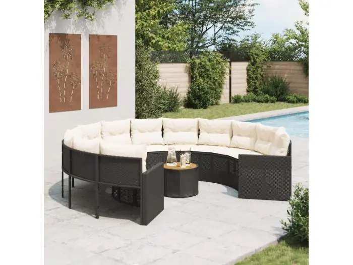 Tuinbank met tafel en kussens rond poly rattan zwart