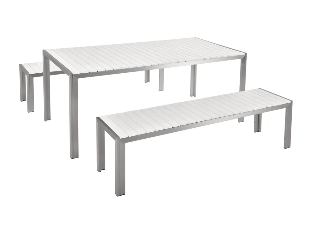 Outdoor eettafel met banken. Een praktische set bestaande uit een tafel en twee banken maakt de tuin, terras of patio elegant. De set is gemaakt van duurzame materialen. Door de combinatie van geborsteld aluminium en kunsthout gaan de meubels lang mee. Zeker wanneer je de meubels goed onderhoudt.Details: Producttype: Tuintafelset. Stijl: Industrieel. Kleur: Wit. Soort materiaal: Kunststof. Hoofdmateriaal: Kunsthout. Overig materiaal: Aluminium. Materiaal bovenkant: Kunststof. Afwerking: Geborsteld. Aantal zitplekken: 4 – 6 personen. Afmetingen: Afmetingen bank: 165x40x45. Hoogte zitting: 45 cm. Afmetingen tafel: 180x90x75 cm. Algehele afmetingen: 180x90x75. Gewicht: 55 kg. Draagvermogen tafel: 100 kg. Aanbod omvat: 1 x Tafel, 2 x Bank. Belangrijkste eigenschappen: Modern terras- en tuinmeubilair, Speciaal gemaakt voor gebruik buitenshuis, Weersbestendig materiaal, Onderhoudsvriendelijk en duurzaam materiaal, UV-bestendigheidsklasse, Roestvrijstalen frame. Montageinformatie: Gedeeltelijke montage vereist.45-60 min.. Extra informatie: Plaats geen glas rechtstreeks op het oppervlak van het item, aangezien dit de temperatuur van het zonlicht vergroot, waardoor oververhitting en schade aan het product kan ontstaan., Voor dit product bieden we een gedetailleerd onderhoudsboek aan om ervoor te zorgen dat het meubilair er zo lang mogelijk goed uit blijft zien. Bekijk de onderhoudsinstructies en tips om goed voor je nieuwe product te kunnen zorgen – je vindt deze bij de montagehandleiding van het product op onze website. Tekst weerstand: UV-bestendige meubels hebben een verhoogde weerstand tegen vervaging of verkleuring. We raden echter aan om het product overdekt of onder een beschermhoes te bewaren wanneer het niet in gebruik is. Dit zorgt ervoor dat je langer kunt genieten van je tuinmeubels. Weerstand: Windbestendig. Onderhoudstips: Kunsthout. 1.Maak schoon met een mild schoonmaakmiddel op zeepbasis en een zachte doek., 2.Houd uit de buurt van warmtebronnen, zoals de barbecue of vuurkorf, aangezien vonken het meubelstuk kunnen beschadigen. Leg daarom ook geen hete gebruiksvoorwerpen, zoals hete barbecuetangen, op het oppervlak., 3.Het materiaal is bestand tegen gemiddelde weersomstandigheden. Maak buiten het seizoen gebruik van een beschermhoes of bewaar de meubels op een koele, droge plek. Aluminium. 1.Maak schoon met een sopje met een mild schoonmaakmiddel. Stof af met een zachte doek., 2.Gebruik buiten het seizoen een beschermhoes of bewaar de meubels op een koele, droge plek, wanneer mogelijk.