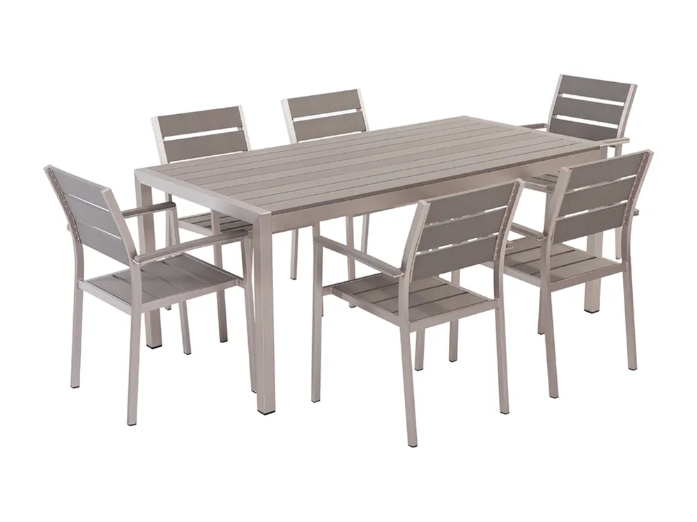 Mooie grijze kunsthouten tuinset. Cre?er een mooi middelpunt in je eigen tuin met onze klassieke tuinset. Hij roept herinneringen op aan licht en zonnig Toscane. Dit meubel is gemaakt van sterk kunsthout en geanodiseerd aluminium. Zowel kunsthout als aluminium zijn recyclebaar en milieuvriendelijk. De set komt compleet met tafel en 6 stoelen. Over het algemeen voldoende voor een terras, patio of groter balkon. Deze set is makkelijk schoon te maken.Details: Producttype: Tuintafelset. Stijl: Industrieel. Kleur: Grijs. Soort materiaal: Kunststof. Hoofdmateriaal: Kunsthout. Overig materiaal: Aluminium. Materiaal bovenkant: Kunststof. Afwerking: Geanodiseerd. Aantal zitplekken: 6 personen. Afmetingen: Afmetingen stoel: 54x57x88 cm. Hoogte zitting: 45 cm. Afmetingen tafel: 180x90x76 cm. Algehele afmetingen: 180x90x76. Gewicht: 64 kg. Draagvermogen stoel: 150 kg. Draagvermogen tafel: 150 kg. Aanbod omvat: 1 x Tafel, 6 x Stoel. Belangrijkste eigenschappen: Modern terras- en tuinmeubilair, Tijdloos design, Geschikt voor binnen- en buitengebruik, Onderhoudsvriendelijk en duurzaam materiaal, Plaatsbesparend stapelbaar. Montageinformatie: Gedeeltelijke montage vereist.20-40 min.. Extra informatie: Plaats geen glas rechtstreeks op het oppervlak van het item, aangezien dit de temperatuur van het zonlicht vergroot, waardoor oververhitting en schade aan het product kan ontstaan., Voor dit product bieden we een gedetailleerd onderhoudsboek aan om ervoor te zorgen dat het meubilair er zo lang mogelijk goed uit blijft zien. Bekijk de onderhoudsinstructies en tips om goed voor je nieuwe product te kunnen zorgen – je vindt deze bij de montagehandleiding van het product op onze website. Tekst weerstand: UV-bestendige meubels hebben een verhoogde weerstand tegen vervaging of verkleuring. We raden echter aan om het product overdekt of onder een beschermhoes te bewaren wanneer het niet in gebruik is. Dit zorgt ervoor dat je langer kunt genieten van je tuinmeubels. Weerstand: Windbestendig. Onderhoudstips: Aluminium. 1.Maak schoon met een sopje met een mild schoonmaakmiddel. Stof af met een zachte doek., 2.Gebruik buiten het seizoen een beschermhoes of bewaar de meubels op een koele, droge plek, wanneer mogelijk. Kunsthout. 1.Maak schoon met een mild schoonmaakmiddel op zeepbasis en een zachte doek., 2.Houd uit de buurt van warmtebronnen, zoals de barbecue of vuurkorf, aangezien vonken het meubelstuk kunnen beschadigen. Leg daarom ook geen hete gebruiksvoorwerpen, zoals hete barbecuetangen, op het oppervlak., 3.Het materiaal is bestand tegen gemiddelde weersomstandigheden. Maak buiten het seizoen gebruik van een beschermhoes of bewaar de meubels op een koele, droge plek.