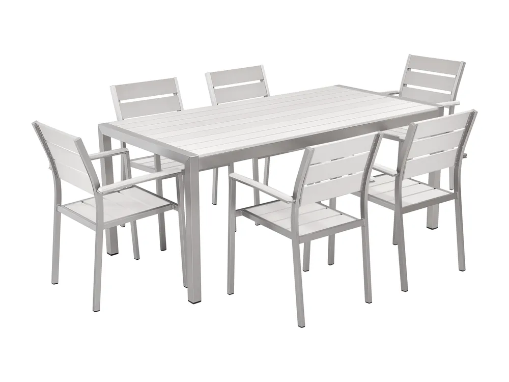 Mooie witte kunsthouten tuinset. Cre?er een mooi middelpunt in je eigen tuin met onze klassieke tuinset. Hij roept herinneringen op aan licht en zonnig Toscane. Dit meubel is gemaakt van sterk kunsthout en geanodiseerd aluminium. Zowel kunsthout als aluminium zijn recyclebaar en milieuvriendelijk. De set komt compleet met tafel en 6 stoelen. Over het algemeen voldoende voor een terras, patio of groter balkon. Deze set is makkelijk schoon te maken.Details: Producttype: Tuintafelset. Stijl: Industrieel. Kleur: Wit. Soort materiaal: Kunststof. Hoofdmateriaal: Kunsthout. Overig materiaal: Aluminium. Materiaal bovenkant: Kunststof. Afwerking: Geborsteld. Aantal zitplekken: 6 personen. Afmetingen: Afmetingen stoel: 54x57x88 cm. Hoogte zitting: 45 cm. Afmetingen tafel: 180x90x76 cm. Algehele afmetingen: 180x90x76. Gewicht: 65 kg. Draagvermogen stoel: 150 kg. Draagvermogen tafel: 150 kg. Aanbod omvat: 1 x Tafel, 6 x Stoel. Belangrijkste eigenschappen: Modern terras- en tuinmeubilair, Tijdloos design, Geschikt voor binnen- en buitengebruik, Onderhoudsvriendelijk en duurzaam materiaal, Plaatsbesparend stapelbaar. Montageinformatie: Gedeeltelijke montage vereist.20-40 min.. Extra informatie: Plaats geen glas rechtstreeks op het oppervlak van het item, aangezien dit de temperatuur van het zonlicht vergroot, waardoor oververhitting en schade aan het product kan ontstaan., Voor dit product bieden we een gedetailleerd onderhoudsboek aan om ervoor te zorgen dat het meubilair er zo lang mogelijk goed uit blijft zien. Bekijk de onderhoudsinstructies en tips om goed voor je nieuwe product te kunnen zorgen – je vindt deze bij de montagehandleiding van het product op onze website. Tekst weerstand: UV-bestendige meubels hebben een verhoogde weerstand tegen vervaging of verkleuring. We raden echter aan om het product overdekt of onder een beschermhoes te bewaren wanneer het niet in gebruik is. Dit zorgt ervoor dat je langer kunt genieten van je tuinmeubels. Weerstand: Windbestendig. Onderhoudstips: Aluminium. 1.Maak schoon met een sopje met een mild schoonmaakmiddel. Stof af met een zachte doek., 2.Gebruik buiten het seizoen een beschermhoes of bewaar de meubels op een koele, droge plek, wanneer mogelijk. Kunsthout. 1.Maak schoon met een mild schoonmaakmiddel op zeepbasis en een zachte doek., 2.Houd uit de buurt van warmtebronnen, zoals de barbecue of vuurkorf, aangezien vonken het meubelstuk kunnen beschadigen. Leg daarom ook geen hete gebruiksvoorwerpen, zoals hete barbecuetangen, op het oppervlak., 3.Het materiaal is bestand tegen gemiddelde weersomstandigheden. Maak buiten het seizoen gebruik van een beschermhoes of bewaar de meubels op een koele, droge plek.