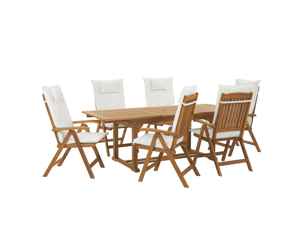 Stijlvol acaciahouten tuinset voor 6 personen met kussens in cremewit. Dit prachtige tuinset bestaat uit een rechthoekige tuintafel en 6 comfortabele tuinstoelen met armleuningen en biedt daarmee voldoende ruimte voor je volgende tuinfeest. De praktische tuintafel kan worden verlengd tot een totale lengte van 220 cm. De verlengbladen zijn ge?ntegreerd in de tafel en hebben een opening voor een parasol. In de voet zit een stabiliteitsmechanisme voor de parasol. De stoelen worden gekenmerkt door uitmuntend zitcomfort en een elegante uitstraling. De brede armleuningen bieden extra comfort. Uiteraard zijn de stoelen inklapbaar om ruimte te besparen. Het materiaal van de meubels, acaciahout, heeft een mooie, warme kleur. Zet de tuinset wanneer deze niet gebruikt wordt op een droge plek, of dek deze af met een beschermhoes om er nog langer plezier van te kunnen hebben.Details: Producttype: Tuintafelset. Stijl: Traditioneel. Kleur: Lichte houtkleur. Kap: Gebroken wit. Soort materiaal: Hout. Hoofdmateriaal: Acaciahout. Overig materiaal: Polyester. Materiaal bovenkant: Hout. Material Composition: 100% polyester. Afwerking: Ge?lied. Aantal zitplekken: 6 personen. Afmetingen: Afmetingen stoel: 54x69x105 cm. Hoogte zitting: 44 cm. Afmetingen tafel: 160/220x90x74 cm. Algehele afmetingen: 220x90x74. Gewicht: 95 kg. Draagvermogen stoel: 160 kg. Draagvermogen tafel: 75 kg. Aanbod omvat: 6 x Kussen, 1 x Tafel, 6 x Stoel. Belangrijkste eigenschappen: Rugleuning verstelbaar in 6 posities, Tafelblad met gat voor parasol, Praktische touwtjes voor gemakkelijke bevestiging aan de zitting, Perfect gevormde armleuningen, Gemaakt van natuurlijk resistente materialen, UV-bestendigheidsklasse 5 (ISO 105-B02), Om de kwaliteit te behouden, moet het beschermd worden tegen water en regen, Opgevouwen op te bergen. Montageinformatie: Gedeeltelijke montage vereist.20-40 min.. Extra informatie: Voor dit product bieden we een gedetailleerd onderhoudsboek aan om ervoor te zorgen dat het meubilair er zo lang mogelijk goed uit blijft zien. Bekijk de onderhoudsinstructies en tips om goed voor je nieuwe product te kunnen zorgen – je vindt deze bij de montagehandleiding van het product op onze website., Hout is een natuurproduct. Kleur- en structuurverschillen, nerven, knoesten, barsten en andere natuurkenmerken zijn een bewijs van echtheid en geen fouten die recht geven op vervanging Tekst weerstand: Dit product is gemaakt van materiaal met een hoge bestendigheid tegen vlekken. Verkleuring zullen dus niet snel te zien zijn en zullen gemakkelijk schoon te maken zijn. Wanneer je vlekken gaat verwijderen, volg dan de onderhoudsinstructies. Weerstand: Spat- / vochtbestendig. Onderhoudstips: Acaciahout. 1.Maak schoon met een mild schoonmaakmiddel en een zachte doek met de houtnerf mee. Droog meteen na reiniging., 2.Geoliede meubels zullen voor gebruik en na het seizoen v????r het opbergen opnieuw in de olie gezet moeten worden, vooral in een vochtig klimaat., 3.Maak buiten het seizoen en bij regen gebruik van een beschermhoes of plaats wanneer mogelijk de meubels op een koele, droge plek. Polyester. 1.Maak schoon met droogshampoo en een natte spons of een mild schoonmaakmiddel., 2.Oppervlakken kunnen met een passend opzetstuk worden gestofzuigd., 3.Wanneer niet in gebruik, zorg er dan voor dat het product op een schone en droge plek wordt opgeslagen.