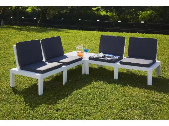 OUTDOOR LOUNGE SET – Tuinset met 4 zitplaatsen met rugleuning en 1 multifunctionele module, Lounge met kussens, 100% Made in Italy, Wit. STRUCTUUR EN GEBRUIK – Artikel bestaande uit een elegante buitenset voor vier personen, samengesteld met vier zitplaatsen met rugleuning en een multifunctionele module – De ruime en uitnodigende stoelen garanderen ontspanning en comfort in uw eigen huis – De module kan comfortabel gebruikt worden als centrale tafel of kan tussen de stoelen geplaatst worden – Perfecte zithoek voor de inrichting van uw buiten- of binnenruimte, dankzij de versterkte kunststofsamenstelling met een lameleffect dat de stijl versterkt – Perfect voor brunches en aperitieven op het terras, de veranda, de tuin of om te ontspannen bij het zwembad. 100% MADE IN ITALY – De 100% Italiaanse productie garandeert betrouwbaarheid weerstand en duurzaamheid in de loop van de tijd – De aandacht voor productieprocessen, de keuze van hoogwaardige grondstoffen en aandacht voor detail maken dit product van nobel vakmanschap. TECHNISCHE EIGENSCHAPPEN – Volledig gemaakt van resistent polypropyleen, waardoor het overal in de open lucht kan worden geplaatst , bestand tegen zonlicht en regen, waterdicht en waterafstotend – Wasbaar, gemakkelijk schoon te maken – Snelle en eenvoudige montage – Ideaal voor zitplaatsen voor vier personen. PRODUCTAFMETINGEN IN CM – Zitting met rugleuning: 65x65h70, Multifunctionele module: 65x65h33