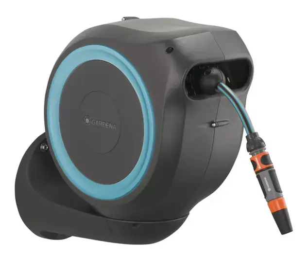 Tuinieren is handiger en gemakkelijker dan ooit met de wandslangenbox RollUp S. Deze helpt uw tuin netjes en opgeruimd te houden en voorkomt hinderlijk struikelgevaar als gevolg van een rondslingerende slang. De praktische slangopslag is eenvoudig aan de muur van uw huis te bevestigen en wordt met een flexibele aansluitslang aangesloten op de kraan. Dankzij de stevige muurbeugel kan de slangenbox meer dan 180 graden worden gedraaid, zodat u elke hoek van uw tuin moeiteloos kunt bereiken. Voor direct gebruik kunt u de tuinslang eenvoudig verlengen tot een lengte van maximaal 15 meter. De tuinslang wordt automatisch in heel korte intervallen vergrendeld zodra u stopt, wat betekent dat de slang eenvoudig en gemakkelijk te hanteren is. Door lichtjes aan het uiteinde van de slang te trekken, wordt de vergrendeling ontgrendeld en een ingebouwde stalen veer met innovatieve RollControl-technologie zorgt voor soepel en gecontroleerd oprollen. De RollControl beschermt de slangenbox en de omgeving tegen schade als gevolg van het te snel inrollen. Om knikken of knopen in de slang te voorkomen, heeft de box een ge?ntegreerde slanggeleider. Dankzij de slang- en kraanaansluitingen van het Original GARDENA System kunt u eenvoudig en flexibel een verlengstuk of ander compatibel GARDENA element op de slang aansluiten. U hebt altijd uw GARDENA slangopzetstukken bij de hand. Ze kunnen onder de muurbeugel worden bevestigd en daar worden opgeborgen om ruimte te besparen. De GARDENA wandslangenbox is UV- en vorstbestendig en kan het hele jaar door probleemloos aan de muur van het huis blijven bevestigd. Het hoogwaardige materiaal biedt u een lange levensduur en gebruiksgemak zonder onderhoud. Samen met de wandslangenbox ontvangt u een muurbeugel, een flexibele aansluitslang, alle benodigde Original GARDENA System en montageonderdelen en een mondstuk met twee verschillende sproeiopties. Dit hoogwaardige product wordt geleverd met een garantie van vijf jaar van GARDENA. Bewatering die altijd gebruiksklaar is , dankzij de GARDENA wandslangenbox RollUp S.