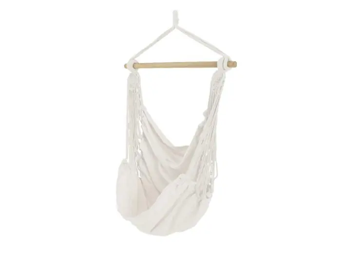 Ontdek de witte katoenen en polyester hangmat, model SCHOMMEL KLEDING BORNEO. Perfect voor binnen, afmetingen 100x130cm. 5% korting voor leden.