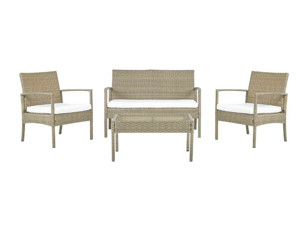Trendy loungeset gemaakt van hoogwaardig polyrattan. Een vierdelige loungeset met kussens zal elke leefruimte buiten verbeteren. Het is gemaakt van een duurzaam, roestbestendig stalen frame met een duurzaam weerbestendig synthetisch rotan. Het blad van gehard glas geeft de tafel een verfijnde uitstraling. De diepe en knusse stoelen hebben praktische armleuningen en comfortabel gevormde hoge rugleuningen. Met zachte kussens kunnen jij en je gasten achterover leunen, ontspannen en genieten van het buitenleven.Details: Producttype: Zitgroep. Stijl: Traditioneel. Kleur: Natuurlijk. Soort materiaal: PE rotan. Hoofdmateriaal: PE rotan. Overig materiaal: Staal. Materiaal bovenkant: Glas. Material Composition: 100% polyester. Afwerking: Gepoedercoat. Dichtheid schuim zitting: 22 kg/m3. Aantal zitplekken: 4 personen. Afmetingen: Afmetingen 2-zitsbank: 112x57x77. Afmetingen fauteuil: 60x57x77. Afmetingen salontafel: 76x44x38. Dikte zitting: 5 cm. Hoogte zitting: 34 cm. Algehele afmetingen: 112x57x77. Gewicht: 31 kg. Draagvermogen tafel: 10 kg. Draagvermogen per persoon: 90 kg. Aanbod omvat: 1 x Salontafel, 1 x Tweezitsbank, 2 x Fauteuil, 3 x Zitkussen. Belangrijkste eigenschappen: Het tafelblad is met zuignapjes bevestigd., Klassiek design, UV-bestendigheidsklasse 5 (ISO 105-B02), Non-slip dopjes, Verwijderbare kussenhoezen, Robuust tafelblad gemaakt van veiligheidsglas. Montageinformatie: Volledige montage vereist. Tekst weerstand: Licht waterafstotend waardoor je ze gemakkelijk buiten kan gebruiken, en buiten kan houden ondanks regen en vochtigheid. Wanneer het niet mogelijk is om binnen te zetten wanneer deze niet wordt gebruikt, raden we aan om een hoes te gebruiken. Het langdurig blootstellen van meubels en accessoires aan vocht kan schade veroorzaken. Weerstand: Spat- / vochtbestendig. Onderhoudstips: PE rotan. 1.Maak schoon met een schoonmaakmiddel op zeepbasis. Gebruik geen sterke, chemische schoonmaakmiddelen., 2.Kijk uit met glazen servies of accessoires. Door de lichtreflectie door glas kan het oppervlak van het product worden beschadigd., 3.Bescherm de meubels van direct zonlicht om de levensduur van je meubels te verlengen., 4.Gebruik een beschermhoes, of zet de meubels op een droge en koele plek, buiten het seizoen. Polyester. 1.Was met de hand, gebruik koud water en een milde zeep. Was op de rechterkant met de rits dicht., 2.Niet geschikt voor de droger of om te strijken., 3.Wanneer niet in gebruik, bewaar het product op een schone, droge plek om het te beschermen tegen weersomstandigheden.Veiligheidsglas. 1.Maak schoon met een mild schoonmaakmiddel of glasreiniger en een zachte doek. Maak droog na reiniging met een zachte doek., 2.Gebruik geen schurende schoonmaakmiddelen. Deze kunnen het oppervlak beschadigen., 3.Veeg droog na regen of sneeuw. Gebruik een beschermhoes, of bewaar de meubels op een koele, droge plek, buiten het seizoen., 4.Als het product een glazen craquele effect heeft dan is het belangrijk om het te beschermen tegen vocht.