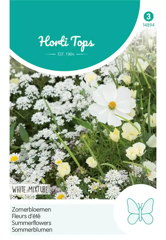 Zomerbloemen – Wit mengselVanaf april tot half juni direkt op de bestemde plaats. Men zaait in rijen of breedwerpig. Geeft uw tuin een verscheidenheid aan bloemen met vele nuances in wit. Ze hebben een grote aantrekkingskracht op vlinders.